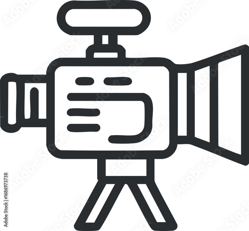 Simple black line icon of a video camera on a tripod representing filming and video recording equipment