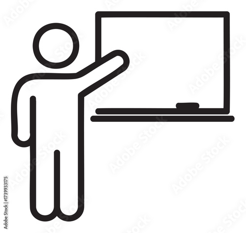 Simple black outline icon of a person pointing to a chalkboard, symbolizing teaching, education, and presentation concepts.