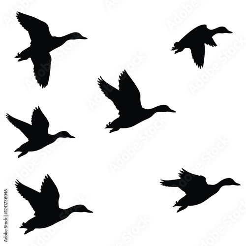 Simple black silhouettes of ducks soaring through the air against a pure white background