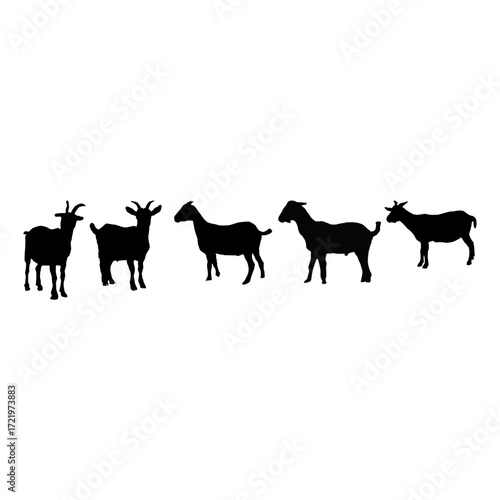 Simple black silhouettes of four goats, arranged in a horizontal row against a plain white background.