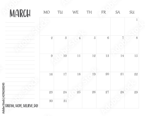 Simple calendar organizer 2020 grid with lettering month name and motivation phrase "Dream, hope, believe, do".