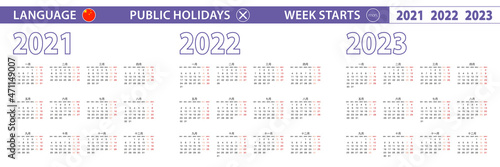 Simple calendar template in Chinese for 2021, 2022, 2023 years. Week starts from Monday.