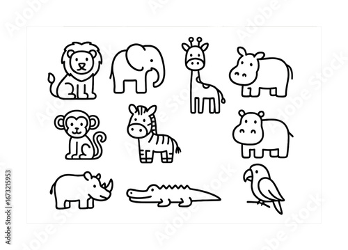 Simple cartoon jungle animals: lion, elephant, giraffe, and more