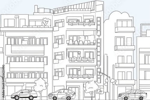 Simple coloring page of apartment buildings with bold lines, clouds in sky, and cars on street in minimalist style