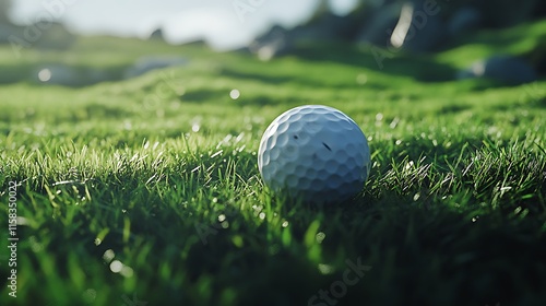 Simple composition of a golf ball resting on a grassy surface with clear focus