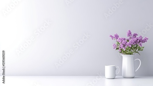 Simple, elegant, minimalist interior scene featuring a bouquet of lilac flowers in a white vase and a white mug on a white surface against a white wall