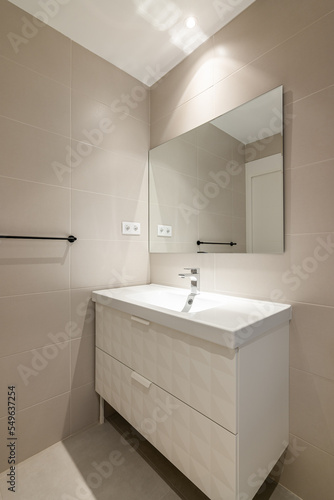 Simple, empty and modern bathroom with beige tiles, sink and mirror
