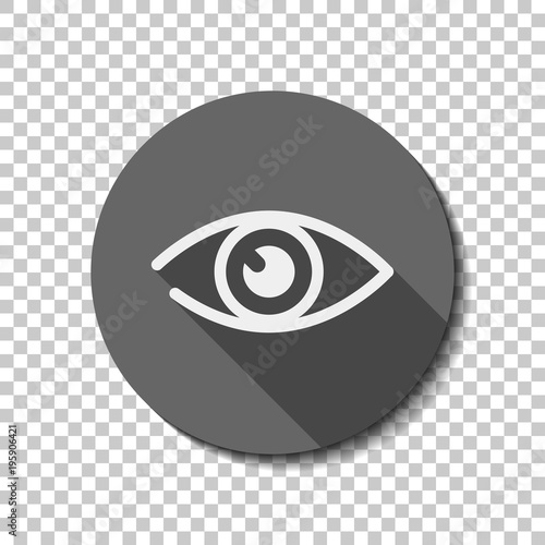 simple eye icon. White flat icon with long shadow in circle on transparent background