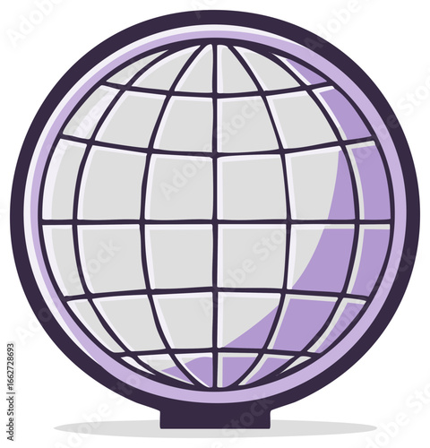 Simple flat design globe icon with purple outline and grid lines symbolizing the world