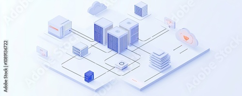 Simple flat design of cloud network architecture, visualizing virtual servers, security firewalls, and API connections
