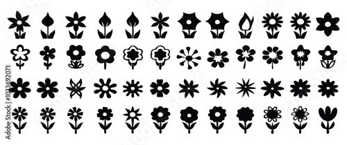 Simple Flower Icons in SVG Black Silhouettes, Featuring Minimalist Floral Shapes on a White Background, Perfect for Graphic Design and Digital Projects