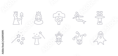 simple gray 10 vector icons set such as ghost, joker, king, magic, magic wand, magician, mermaid. editable vector icon pack