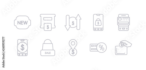 simple gray 10 vector icons set such as insert coin, loyalty card, map pointer, merchandise, mobile money, mobile payment, mobile shopping. editable vector icon pack