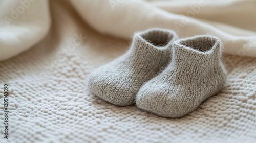 Simple gray baby booties with a felt texture, on a light beige textured background