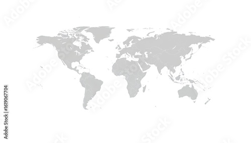 Simple grey world map illustration, graphic representation of Earth continents, countries. Minimalist design for global business, international trade, travel, presentations. Clean graphic for