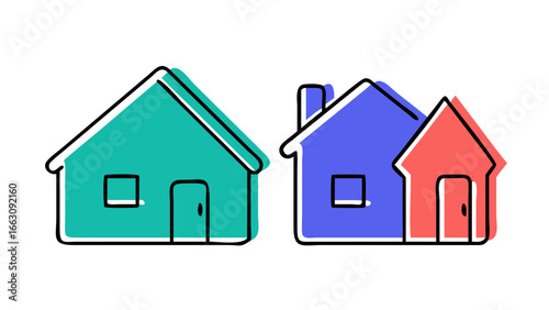 Simple hand drawn style houses in teal blue and coral colors with black outline on a black background
