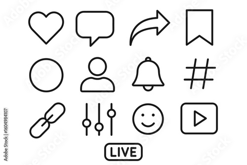 Simple icon set: heart, speech bubble, arrow, bookmark, user, bell, hashtag, link, controls, smiley, play, live