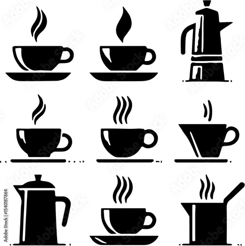 Simple icon set showing different coffee cups and pots in black and white, featuring steam and minimal stylized designs.