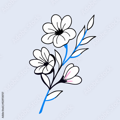 Simple Line Art Flower Drawing, White Flowers, Blue Stem