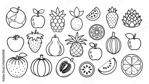 Simple Line Art Fruit Icons: Apples, Strawberries, Citrus Slices, Watermelon, and Avocado.