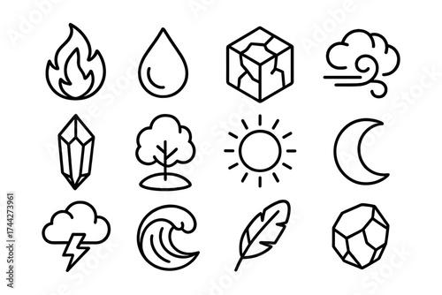 Simple line art icons representing elements and nature with minimalist style