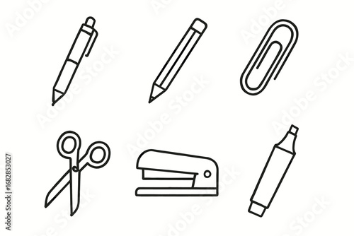 Simple line art of office supplies: pen, pencil, clip, scissors, stapler, marker