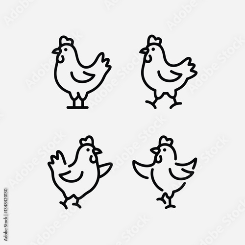 Simple line drawing illustration showcasing four different chicken variations, all are isolated on a clean, light gray backdrop.