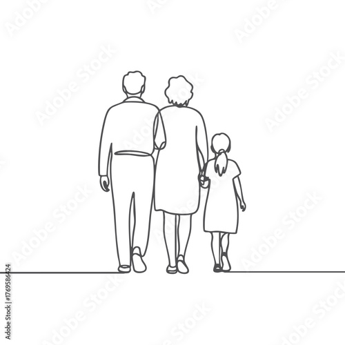 Simple line drawing of a family with two adults and a child walking away