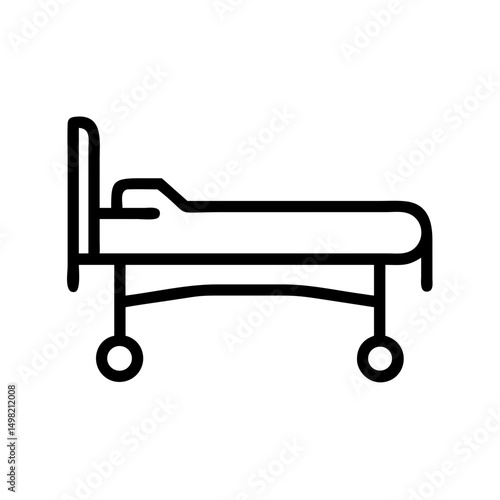 Simple line drawing of a hospital cot with wheels and a headboard in black outline style design