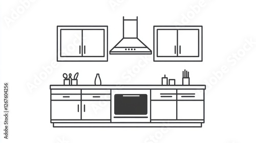 Simple line drawing of a modern kitchen interior. Ideal for use in design guides, websites about home decor, or home renovation projects