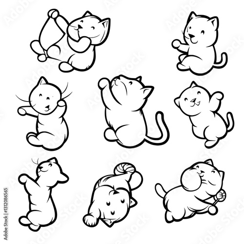 Simple line drawings of cats are a hallmark of modern cartoon cute cat doodles, which often feature playful domestic kittens on a white background