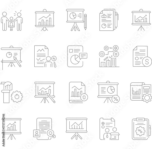 Simple Line Style Business Presentation Screen With Graphic Data Icon Set