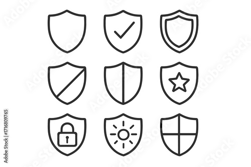 Simple linear shield icon set with editable stroke, minimalistic vector design for cards, apps, banners, posts, security symbol, protective emblem collection illustration
