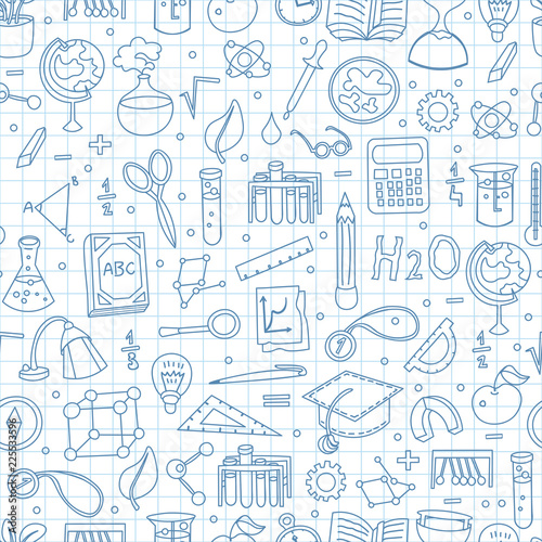 Simple Lined Back to school pattern with school elements and supplies. Welcome back to school seamless background in hand draw style, cartooning elements and cute design for kids. Back to school