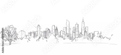 Simple one-line drawing of a city skyline with buildings and trees, white background,