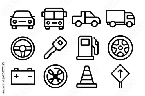 Simple outline icons of vehicles and automotive tools for transport and maintenance