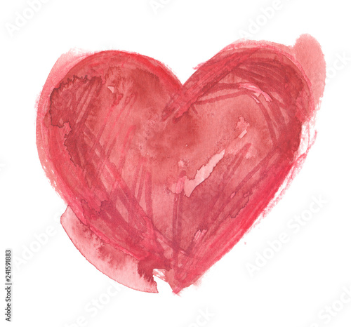 Simple red heart with stains and scribbles. Illustration painted in watercolor and pencil on clean white background