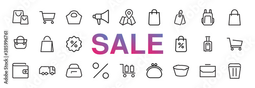 Simple set of bags, shopping and travel icons. Vector illustration Contains icons such as Card, wallet, shopping basket, discount, bowl, package. On a white background, editable stroke black friday