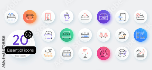 Simple set of Waterproof mattress, Entrance and Lightweight mattress line icons. Include Teapot, Alarm, Table lamp icons. Pillow, Door, Latte web elements. Pillows, Sconce light. Vector
