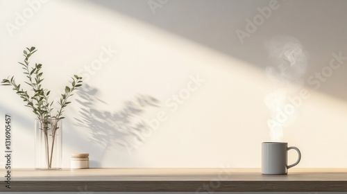 Simple, sunlit, morning scene with a cup of coffee