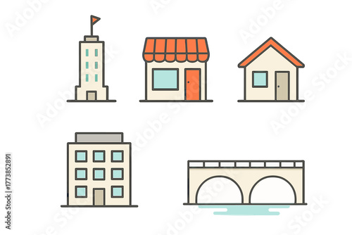 Simple town buildings set featuring skyscraper, shop, house, apartment, and bridge