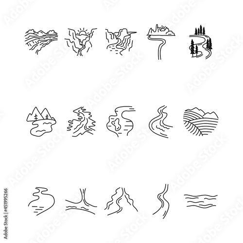 Simple valleys, rivers and mountains icons shapes set. Logo creation kit. Outdoor adventure line art elements bundle. Silhouette linear concept. Stock
