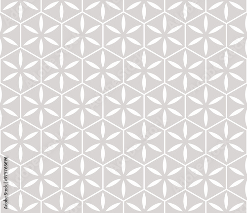 Simple vector gray and white seamless pattern. Abstract floral geometric ornament. Subtle background with flower silhouettes, leaves, lines, hexagonal grid, lattice. Minimalist repeated geo design