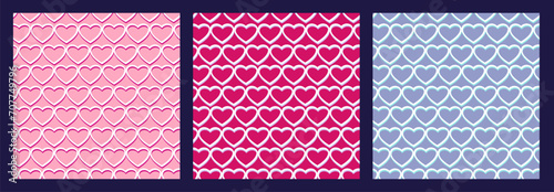 Simple vibrant seamless patterns with geometric hearts. Vector hand drawn shape silhouettes outline heart. Valentine, love wedding backgrounds. Collage templates for textile, fashion, surface