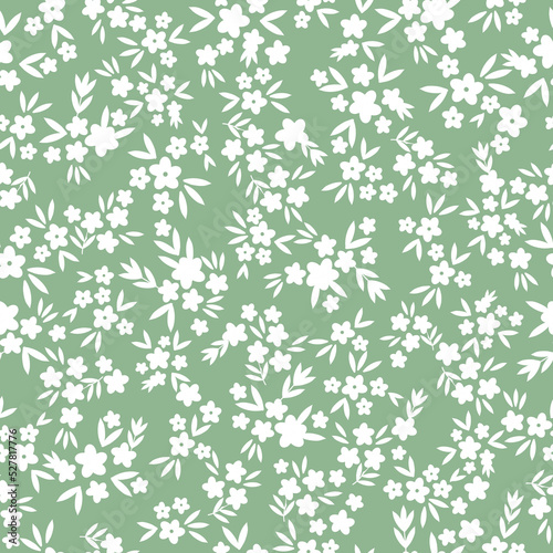 Simple vintage pattern. small white flowers and leaves. light green background. Fashionable print for textiles and wallpaper.