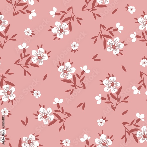 Simple vintage pattern. wonderful white flowers, dark pink leaves. pink background. Fashionable print for textiles and wallpaper.