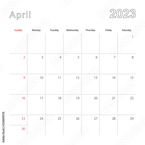 Simple wall calendar for April 2023 with dotted lines. The calendar is in English, week start from Sunday.