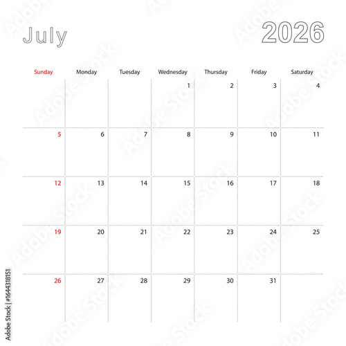 Simple wall calendar for July 2026 with dotted lines. The calendar is in English, week start from Sunday.