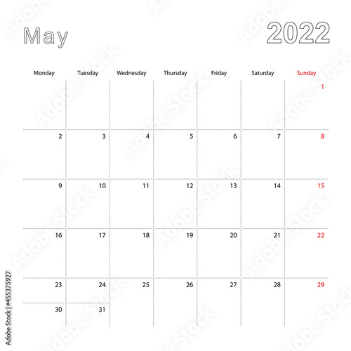 Simple wall calendar for May 2022 with dotted lines. The calendar is in English, week start from Monday.