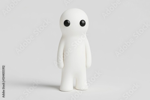 Simple, white figurine with large black eyes. It's a solid, smooth, minimalist figure
